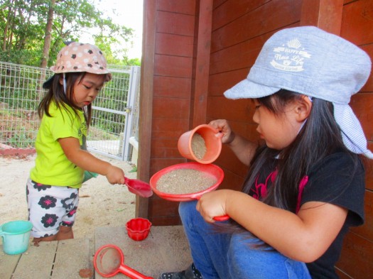自然物を使ったり、鍋やコップ、食べ物などを使ったりして遊んでいます。