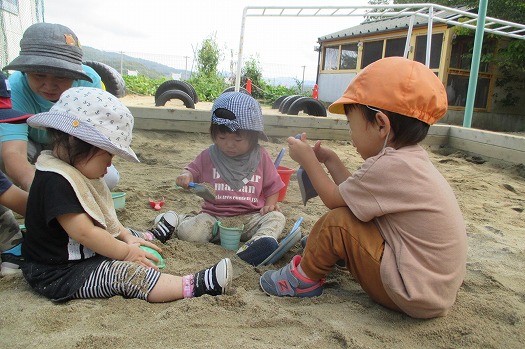 砂場にいる時は、ずっと座って遊んでいましたが、最近は自分の行きたいとことへ