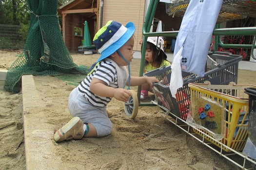 ハイハイや歩行で移動しています。そして砂場の遊具を自分で籠から取り出すなど
