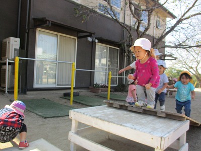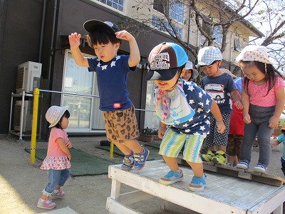 2019年10月11日 せーの、ぴょーん! 2歳児 にじ 先日、斜面台をしました。斜面台が見えると走っていき、すぐに斜面台を登るこどもたち。自分の順番がくると、「せーの」に合わせて、ぴょーんと高く跳んでいました。保育者の声かけで順番も待てていました。またやってみようと思います。 一覧へ戻る