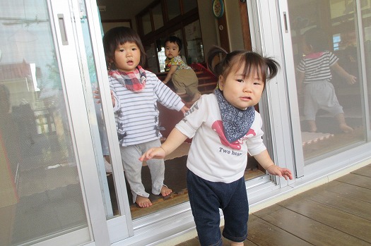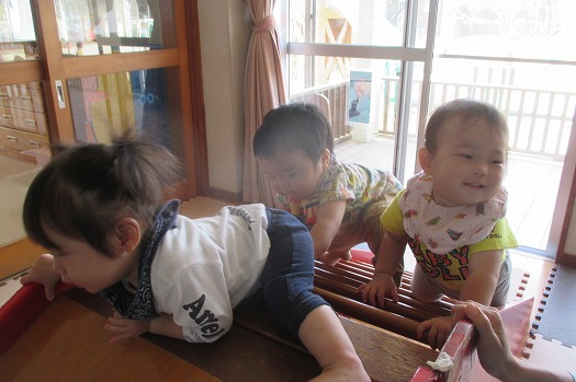 2019年10月10日 探索したよ☆ 0歳児 はな はな組の隣の部屋で斜面台登りをしたり、ゆきぐみのテラスに出てみたり、行きたい所へ自由に 移動し楽しむこどもたちです。外にいる友だちに「おーい」と叫ぶと真似して「おーい」と言っています。 まねっこ上手なこどもたちです。 一覧へ戻る