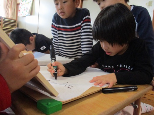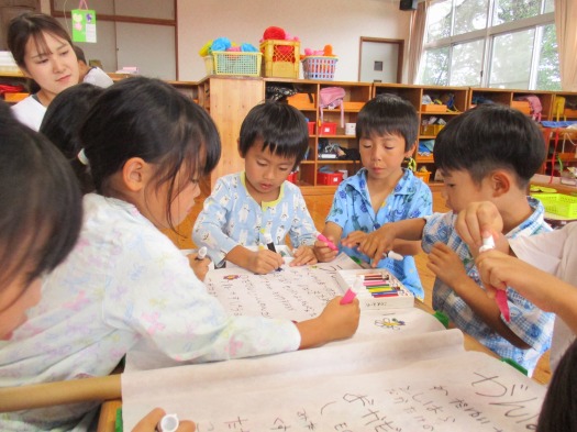 2019年10月18日 そらぐみの仲間 5歳児 そら 運動会に向けて応援旗を作りました。 どんな旗にするかこどもたちに聞くと 「一人一人の名前を書いたらいいんじゃない?」と言う声が。 「書けるかな」と言う子もいましたが、見本を見たり友だちに教えてもらったりして 36人全員の名前を書くことができました。 「わたしたちの名前も入れていい?」と保育者が聞くと「もちろん!」と 嬉しい答えが返ってきました。 最後にみんなで様々な花を描いて完成!! みんなの力がこもった応援旗でより力がわいてくると思います。 一覧へ戻る