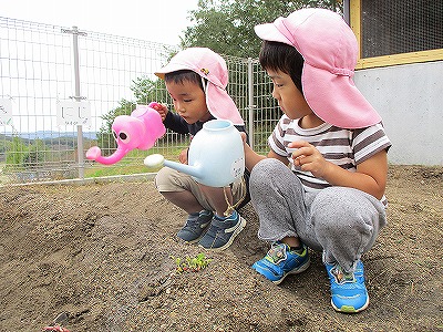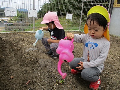 2019年10月21日 水やり 3歳児 つき 子どもたちとつき組の畑を見に行くと… なんと!!先週まいた種から芽がでていました♪ 「わっ!でてきてる~」「すごいね~」と嬉しそうな声が次々と聞かれました。 水やりをしながら、大きくなっていくのを楽しみにしているつき組さんです。 一覧へ戻る