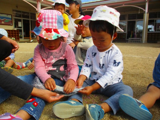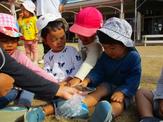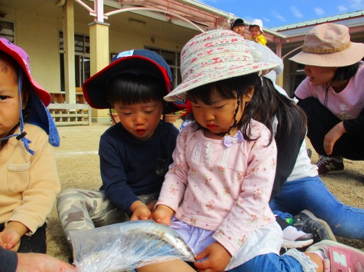 2019年10月23日 さんまキャラバン 2歳児 にじ 今日は、さんまキャラバンがありました。 園庭でビニール袋に入れた生のさんまに触れたり、 炭火焼きのさんまを見たりしました。 「さかな」「おおきい」「めめ(目)」と 興味津々、大興奮のこどもたち。 給食に出たさんまの塩焼きを「おいしい」と たくさん食べて、旬の食材を味わいました。 一覧へ戻る