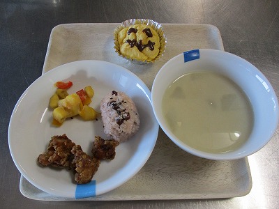 2019年10月31日 給食室(今日の昼食・おやつ) 給食室 ~誕生会メニュー~ 昼食 ・赤飯 ・青のり風味のから揚げ ・カラフルサラダ ・根菜の豆乳スープ おやつ ・ハロウィンカップケーキ ・牛乳 今日は10月の誕生会メニューです。さつまいも、かぼちゃなど旬の食材を使用しました。おやつはバターケーキをカップに入れ焼き、ジャックオーランタンの顔を描きました。みんな喜んで食べていました! 一覧へ戻る
