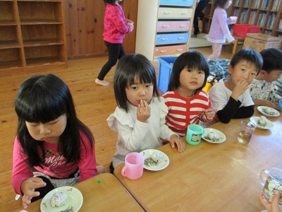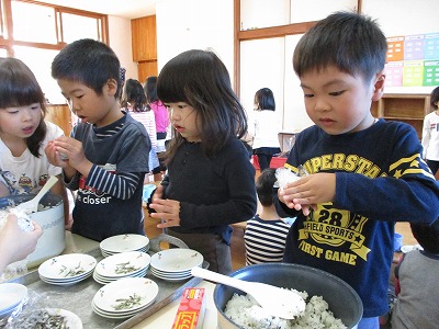 2019年11月08日 おにぎり 4歳児 ほし 先日、おやつにおにぎりがでました。 自分の食べれる量をラップに取り、ギュッギュッと握ります。 自分で握ったおにぎりは特別で、あっという間に食べ終わりました♪ 一覧へ戻る