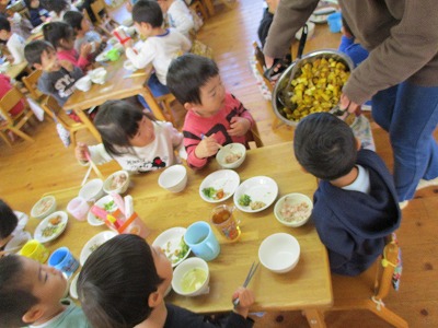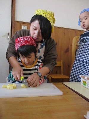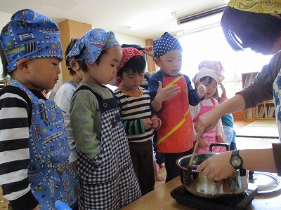 2019年11月08日 クッキング 3歳児 つき 久しぶりにクッキングをしました。 朝、子どもたちに会うと「エプロン持ってきたよー」と嬉しそうな声。 そして今回は、以前掘ったさつま芋を使って大学芋を作りました。 「猫の手,猫の手」と包丁の使い方を思いだしながら切る子どもたち。 出来上がりは給食の後のお楽しみ。 「おいし~」「さいこう~」と満面の笑みで食べました。 一覧へ戻る