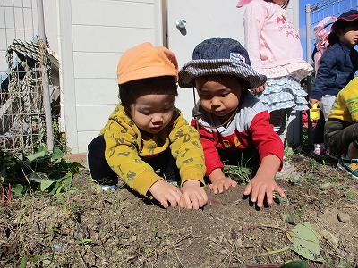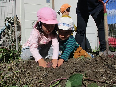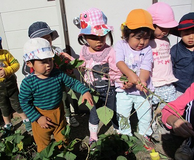 2019年11月05日 うんとこしょ どっこいしょ! 2歳児 にじ 春に畑に植えたさつまいもが成長したので芋掘りをしました。 「芋掘りするよ」と伝えると「さつまいも好き」と楽しみな様子のこどもたち。 早速、畑に行ってみんなでさつまいものつるを持って うんとこしょ どっこいしょ!! おいしそうなさつまいもがたくさん収穫することができました。 収穫したさつまいもを使ってクッキングをするのが楽しみです♪ 一覧へ戻る