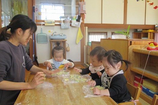 サランラップに包んだ生地をペタペタ。自分たちで成形して素敵なクッキーができました。