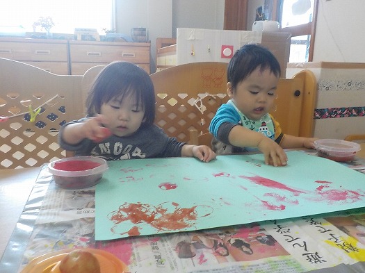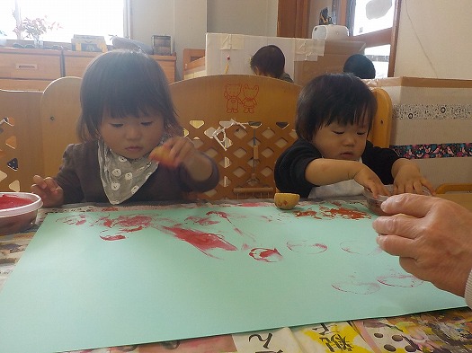 じゃがいもスタンプでペタペタ。始めは”なにこれ”とじゃがいもに戸惑っている姿もありましたが、