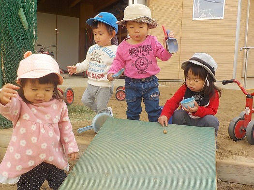 手持ちのどんぐりがなくなると、砂場に転がったどんぐりを集め、転がして楽しむ姿がありました。
