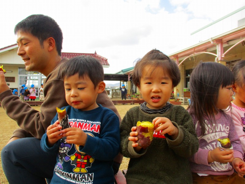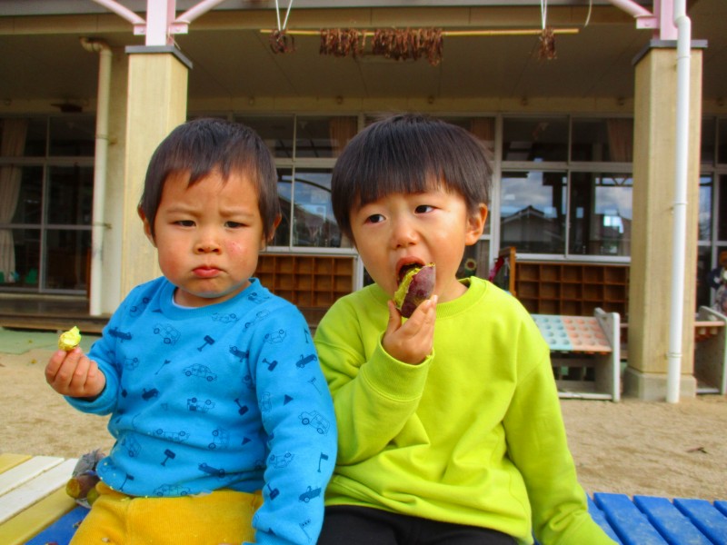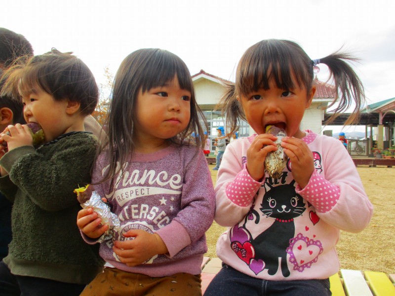 2019年11月19日 旬の味覚をいただきます♪ 2歳児 にじ みんなで芋掘りをしたさつまいもを使って 焼き芋パーティーをしました。 しかし焼き芋を食べるには落ち葉かどんぐりなどの お金を用意しないともらえません。 早速、園庭に出て落ち葉、どんぐり探し* きれいな落ち葉を拾ってそら組の焼き芋屋さんへ。 無事、焼きたての焼き芋をもらいベンチに座って食べました。 「おいしい」とパクパクと食べていたこどもたちです。 旬の味覚は、おいしいですね♪ 一覧へ戻る