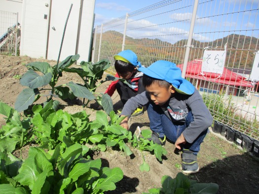 2019年11月26日 たいようさんとあめさん 5歳児 そら 種をまいた大根は芽が出て順調に成長しています。 そんな大根の様子を見に行き、草抜きをしていると手伝ってくれる子がいました。 最近「ありがとう」についての劇を少しずつ作り上げているそらぐみさん。 そこに出てくるたいようさんとあめさんは木に力をくれ、木は大きく成長します。 草抜きを手伝っている子が 「たいようさんとあめさん、大根にも力くれたらいいのに」と言いました。 そうだね、そうすれば大きな大根ができるかもしれないね。 一覧へ戻る
