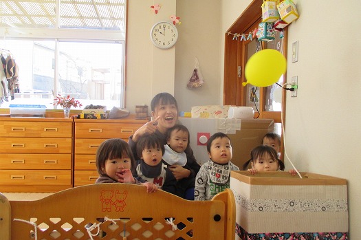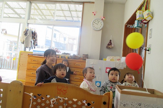 ぷかぷか宙に浮く風船。「え?」「落ちてこないね」とこどもたちだけでなく保育者も