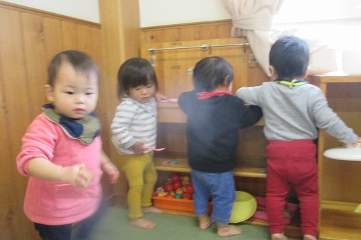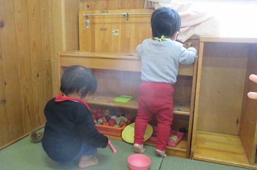 2019年11月29日 つきぐみの部屋で… 0歳児 はな 園内探索で、つきぐみに入ってみました。絵本を見ようと思いましたが、こどもたちは、本よりも ままごとコーナーに一目散。鍋とお玉を持ち、キッチンに立つ子や、机に並べて食べる真似をする子 とそれぞれ楽しむこどもたちでした。またいろいろな部屋の出かけてみようね。 一覧へ戻る