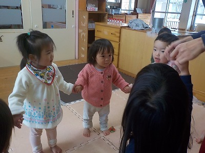 2019年12月02日 みんなで仲良く♪ 1歳児 ゆき 今日は、室内でおどりをしてあそびました。 振り付けの途中に手をつなぐところがあり、みんなで手をつないで踊りました。 その曲が終わっても、手をつないでリズムを取ったり、”手をつなごう”と友だちに手を差し出してアピールしたりしていました。 手をつないであそぶことが楽しいゆきぐみのこどもたちです♪ 楽しかったね。またあそぼうね。 一覧へ戻る