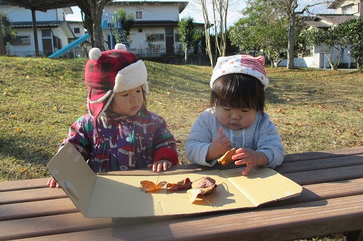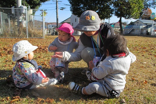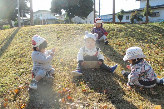 2019年12月04日 どんぐり公園に行ってきました 0歳児 はな 今日は温かく気持ちがいい中、どんぐり公園で斜面滑りや斜面の上り下りを楽しみました。 斜面はなかなかの傾斜なため、立って登る子だけでなく、立って登ろうとしても登れずに ハイハイや高バイで登る子もいました。 しっかり足腰の力を使っている姿がとても素敵でした。 一覧へ戻る
