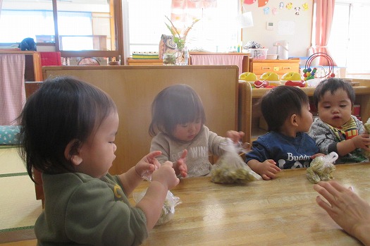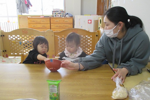 2019年12月06日 最後のさつまいもで☆ 0歳児 はな 畑で採れたさつまいも最後のクッキングをしました。 今回は、さつまいも本来の味を楽しめるようにバターは入れず 豆乳のみ、さつまいもの甘さがあったため砂糖も入れず袋で 茹でても炊いたての暖かさを感じながら、揉んだり叩きつけたりしました。 素材の味をしっかり味わうことができました。 一覧へ戻る