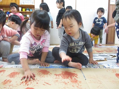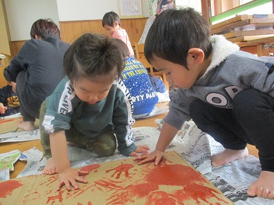 今まで赤や黄色の手形を使って紅葉やいちょうの木を