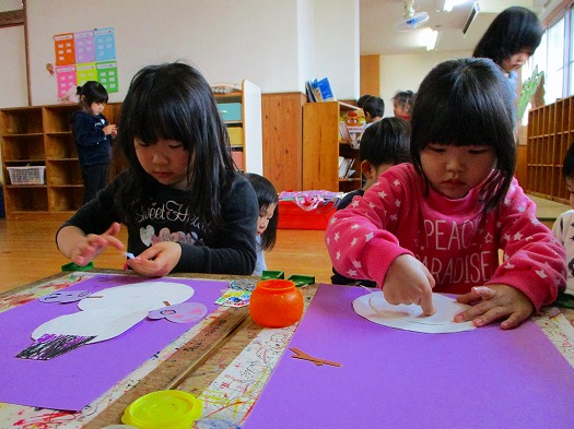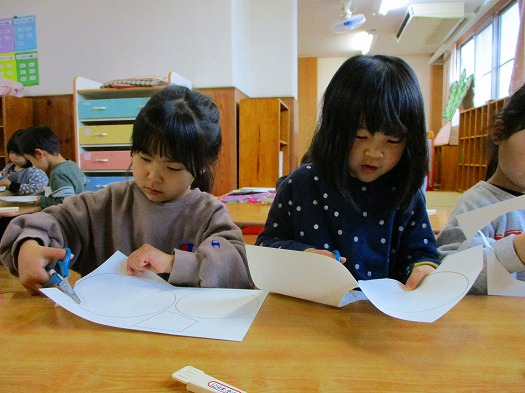 2020年01月07日 切って、貼って… 4歳児 ほし ゆきだるまの製作をしました。 まず、画用紙に描いてある線をハサミで切りました。 ハサミを使うことにも慣れてきましたね♪ 線の上を上手に切ることができました。 帽子と手袋は自分でクレヨンで絵を描いています。 次はのりで貼っていきました。 「帽子はこの辺かな」「手袋かわいい」と話をしながら 貼っていくこどもたちでした。 次は目・鼻・口を福笑いにして楽しみたいと思っています。 どんな顔になるかお楽しみに…☆ 一覧へ戻る