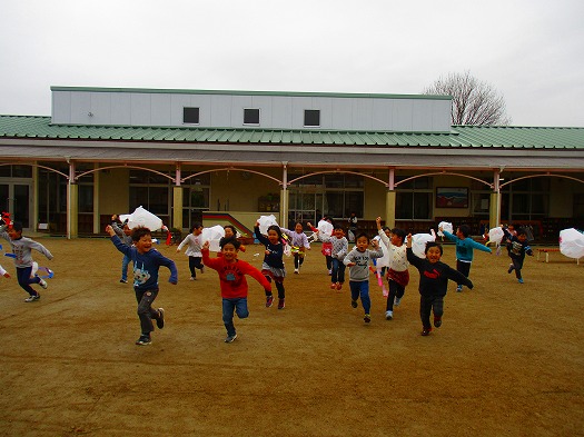 2020年01月08日 たこあげ 5歳児 そら 好きな絵を描いて紐を結んでたこを作りました。 完成すると飛ばしたくてうずうずが伝わるほどでした。 外に出ると一斉に走ってたこあげスタートです。 空気がきちんと入っているか確かめながらたこをあげていました。 一覧へ戻る
