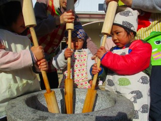 自分たちでお餅をついたり、友だちの姿を応援したりしていました。