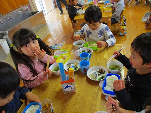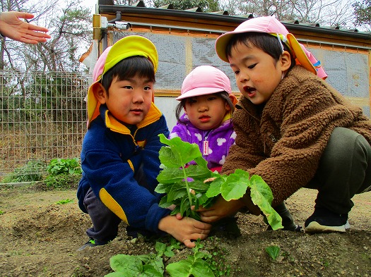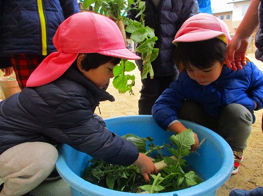 2020年01月22日 つき畑 3歳児 つき 今日は最後の大根収穫をしました。 「うんとこしょ、どっこいしょ!」の掛け声のもと引っこ抜きました☆ 今回は大根の漬物!ゆかり味! ご飯のおともにピッタリでした。 美味しくピカピカに食べた子どもたちです。 次は畑に何を植えようかな♪ 一覧へ戻る