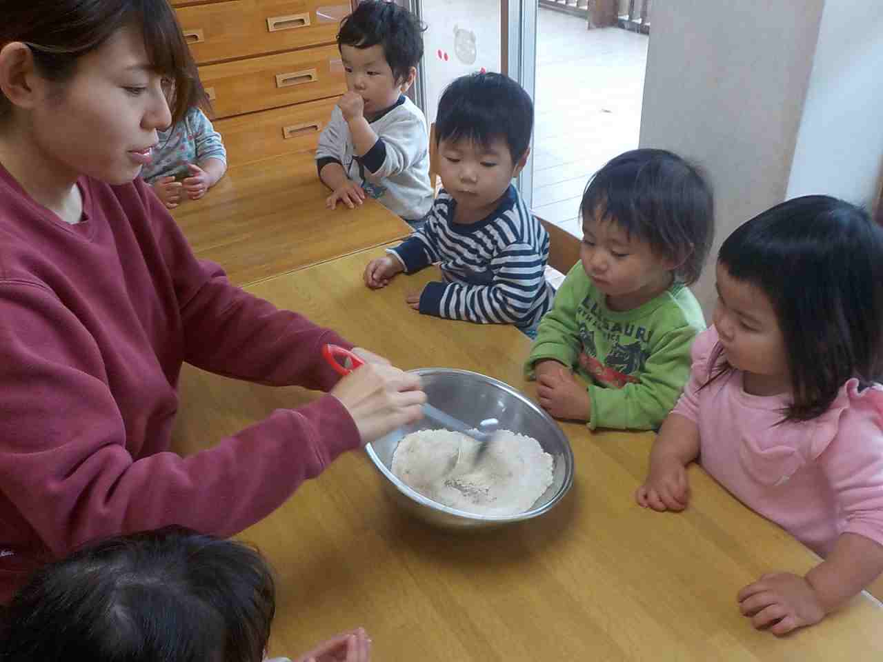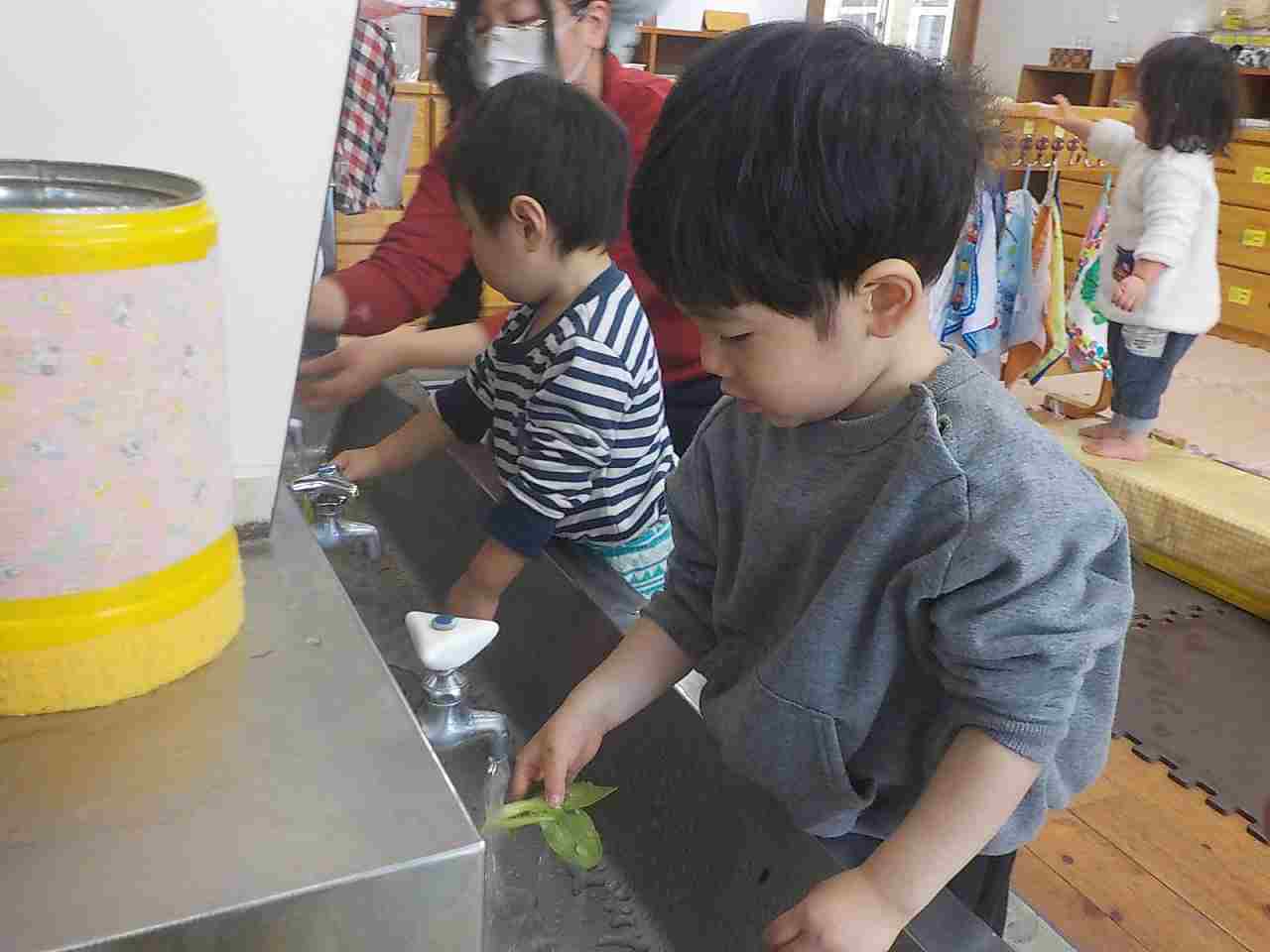 チンゲン菜を一緒に洗って、葉をちぎったり、生地をまぜたりしてクッキングを楽しむことができました。
