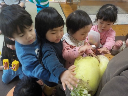 2020年01月27日 おおきな大根 1歳児 ゆき 大きな大きな大根を地域の方に頂きました。 みんな興味津々で触っていました。 中には、大きすぎる大根に見慣れないからか涙が出てしまう子もいました。 一緒に寝ころんだり 大根の体重を図ってみたり 今は部屋に飾って仲よくしています。 一覧へ戻る