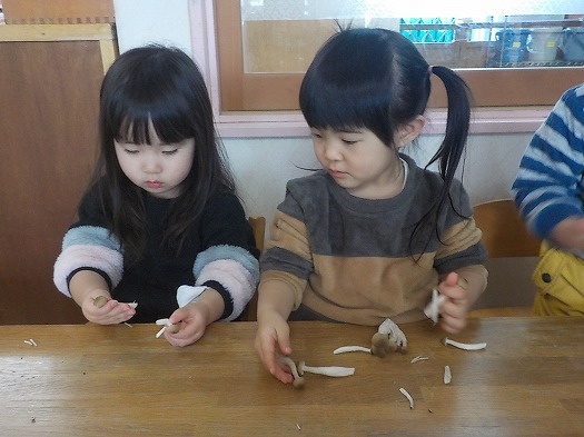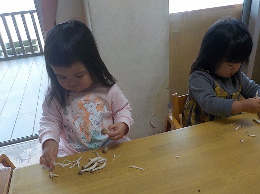 2020年02月13日 ちぎちぎ 1歳児 ゆき 今日は、全クラスでクッキングでした。 お鍋を作るため、ゆきぐみでは、しめじを割いてクッキングに参加しました。 保育者が最初にして見せると、こどもたちも同じようにしめじを割いている姿がありました。 昼食時に、寄せ鍋とおにぎりを食べて楽しむことができました。 楽しかったね。 一覧へ戻る