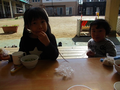 2020年02月14日 おいしいね 2歳児 にじ 鍋パーティーがあり、ももグループはテラスでご飯を食べました。そらぐみさんが作ってくれたおにぎりの具を友だちと見せ合いながら「おいしいね」と食べていました。鍋に入れる白菜をたくさんちぎり、あっという間に終わりました。 一覧へ戻る