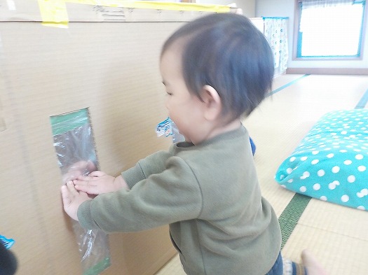 2020年02月18日 だーれだ? 0歳児 はな 公開保育で作ったトンネルに窓を作ったり、その窓にナイロンを貼ってアレンジ。 すると、半透明なこともあり、お互いの手の感触を感じたリ、顔を覗かせて向こう側が見えるか 確かめたリしていました。こどもたち同士のやりとりがとてもかわいいです。 一覧へ戻る