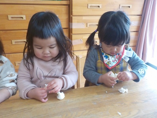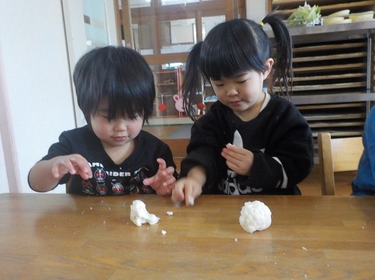 2020年02月20日 ブロッコリー? 1歳児 ゆき カリフラワーを小さくちぎる 給食室のお手伝いをしました。 最初に「これなんだ?」とこどもたちに見せると 「ブロッコリー」という答えが出てきました。 確かに形は一緒!そしてブロッコリーをよく分かっていることに驚きでした。 「かたい」と言いながらも小さくちぎることができました。 どんなおかずに変身するのもか楽しみの一つだね。 一覧へ戻る