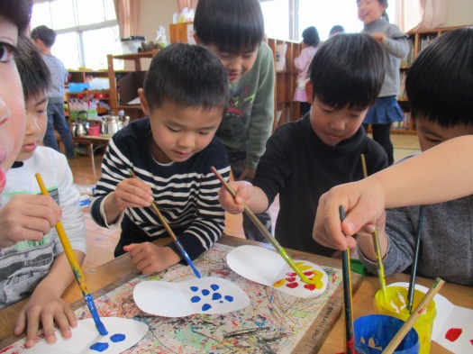 2020年02月27日 デカルコマニー 5歳児 そら デカルコマニーという技法を使って模様を描きました。 開くまでどんな模様になるかわからないので、どもたちはふたつに折りたたむとわくわくした様子で見つめています。 開いたとき、「うわあ」とできた模様にもまた目を輝かせていました。 点やまる、線を描いてそれぞれの模様が出来ました。 様々な模様の鳥が完成する予定です♪ 一覧へ戻る
