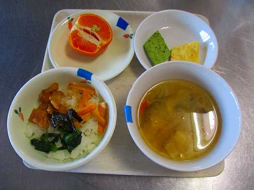鶏飯は鶏肉を揚げて、甘辛いたれで味をつけます。ごはんに残ったたれをかけて手作りの錦糸卵、ほうれんそう、もみのりをのせました。こどもたちにも人気でよく食べていました。野菜クラッカーは人参+粉チーズ、ほうれんそう+黒ごまの2種類の味を作りました。まぜるだけの簡単なおやつなのでレシピがいる方は給食室に声をかけてみてくさいね。