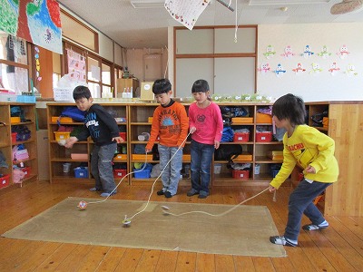 2020年03月03日 こま回し名人 5歳児 そら こま回しが大好きで何度も回して楽しんでいます。 劇団風の子さんが来てコツを教えてもらってから、手の平に乗せたり籠の中を狙って回したりして なんいどをあげてたのしんでいるこどもたちです。 一覧へ戻る