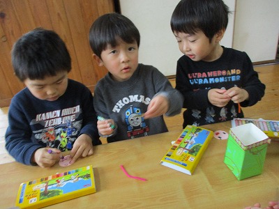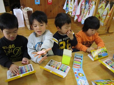 2020年03月04日 プレゼント作り 3歳児 つき そらぐみさんへ渡すプレゼント作りをしました。 たくさん遊んでもらい、お手伝いもしてもらったそら組さんに『ありがとう』の気持ちで描きました! お別れ会の時に渡すのが楽しみです♪ 一覧へ戻る