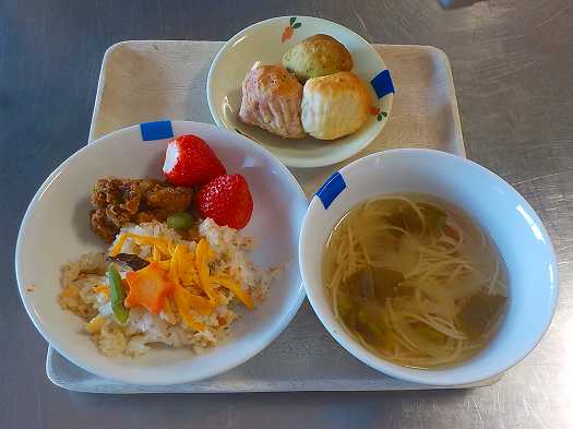2020年03月06日 給食室(今日の昼食・おやつ) おしらせ 給食室 昼食 ・ちらし寿司 ・青のり風味のから揚げ ・そうめん汁 ・いちご おやつ ・3色パン 今日は3月の誕生会メニューです。ちらし寿司はごま、しらす、人参、高野豆腐、干ししいたけが入っています。上には手作りの錦糸卵、いんげん、型抜き人参をのせました。おやつの3色パンはいちご、抹茶、プレーンの3つの味にしました。見た目が華やかだとこどもたちの食も進んだようです。3月うまれのこどもたち、おめでとうございます。 一覧へ戻る