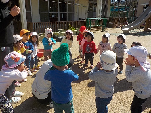 2020年03月10日 くまさーん! 1歳児 ゆき 先日、にじぐみさんと一緒に「むっくりくまさん」をして遊びました。 最初はにじぐみのこどもたちや保育者が逃げるのを見て逃げていましたが、 何度かしていく内に、”「くまさーん!」と呼び、その声でくまさんが目を覚ましたら逃げる”というルールが分かってきて、 「くまさーん!」と声をかけたり、一緒になって逃げたりして楽しむ姿がありました。 また、クラスの中でして楽しみたいです。 楽しかったね。またあそぼうね。 一覧へ戻る