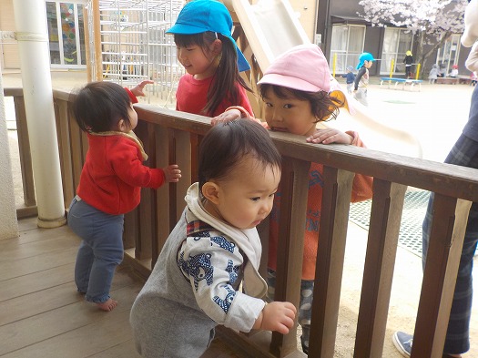 2020年04月07日 はじめまして 0歳児 はな テラスに出ると上のクラスのお兄ちゃん、お姉ちゃんがやってきて 「かわいい」と手を出したことで、はなぐみも喜んで手を差し出していました。 これから、よろしくね。 一覧へ戻る