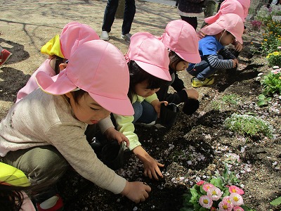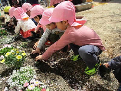 2020年04月14日 種まき(オクラ・日々草) 3歳児 つき 進級会でつき組がもらった種を蒔きました。 オクラはポットに小石と土を入れて苗作りです。 日々草はプランターにぱらぱらと蒔いて目が出るのを待ちます。 また暖かくなりそうで、また、雨上がりの湿った土で早く目が出てほしいです。 花壇の花を抜かないように少し種まきの土をもらいました。 「このくらい?」量を聞きながら丁寧にポットに入れてから穴を開けて種まきです。 一覧へ戻る