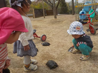 2020年04月17日 かめさん 1歳児 ゆき かめの散歩を観察しました。 かめが動いている方を指差して眺めています。 怖がることなく触りに行く子や、少し怖がっている子などなど反応が違います。 一覧へ戻る