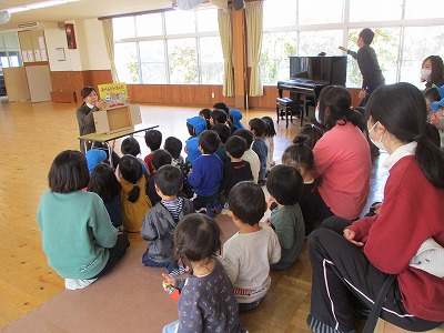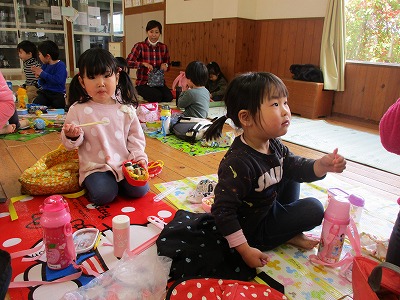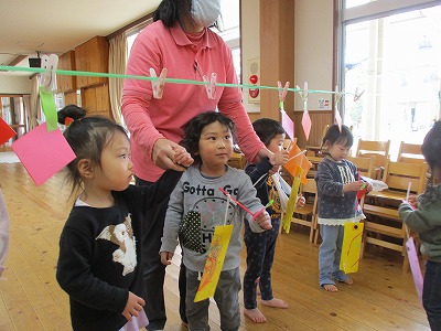 2020年04月24日 健脚ごっこをしたよ 3歳児 つき 健脚活動の日でしたが、園内で散歩し、ホールでこいのぼり行進をしたり、いちご狩りをしたり、また、紙芝居を見たり踊ったりして楽しみがいっぱいでした。その後は、お楽しみの弁当です。ホールでシートを広げ、夢中で食べていました。準備をありがとうございました。 こいのぼりを手にいちご狩り…何色のイチゴが取れたかな。 「おべんとうのえんそく」の紙芝居 お弁当に舌つづみ…待ちに待った時間です。 一覧へ戻る