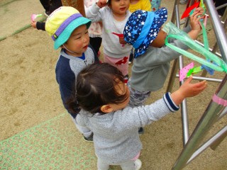 友だちと手を繋いで園庭を散歩しました。