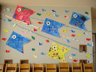 2020年05月02日 5月のホールの壁面はそら組とつき組の担当です。 くじら(事務室) 勢いのあるコイが元気に泳いでいます。 そら組はクレヨンと絵具を使ったはじき絵のコイが5匹。 つき組は折り紙で小さいコイをたくさん。それからハサミの一回切りで切り落とした色画用紙を紙テープにちりばめたもの(水か風がイメージです)。 勢いよく泳ぐコイのように元気に逞しくすくすくと大きくなあれ! 一覧へ戻る
