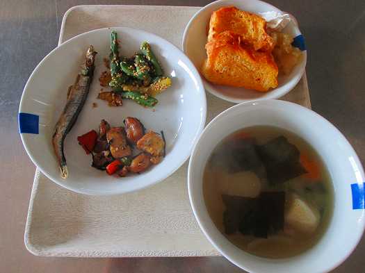 2020年05月12日 給食室(5月11日の給食、おやつ) 給食室 昼食 ・ごはん ・厚揚げと鶏肉のひじき煮 ・ししゃもの素焼き ・いんげんのごま和え ・麩のみそ汁 おやつ ・フレンチトースト ・牛乳 月曜日のおやつはおたのしみです。 5月11日のおやつはフレンチトーストで、つけ合わせに りんごのコンポートとホイップクリームを添えました。 一覧へ戻る