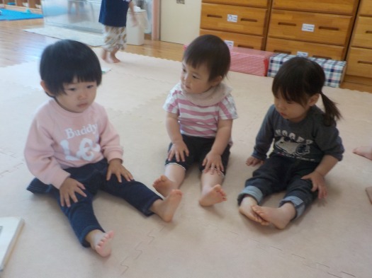 すると、手をつないでいた子もまねをして、一緒に座り込むまみました。