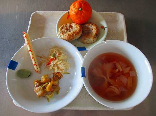 19日のおやつは、豚ミンチ、ねぎ、たまねぎ、にんじん、れんこん、干ししいたけ、しょうが、が入った、「野菜たっぷりお焼き」です。