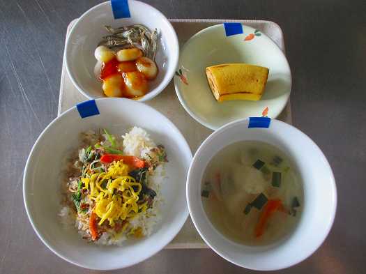 2020年05月21日 給食室(5月21日の給食、おやつ) 給食室 昼食 ・ビビンバ ・ワンタンスープ ・バナナ おやつ ・みたらし団子 ・煮干し ビビンバはこどもたちに人気のメニューで、 おかわりも空っぽになって返ってきました。 みたらし団子には、のどにつまりにくくする工夫として、 だんご粉と白玉粉の他に、豆腐が入っています。 一覧へ戻る