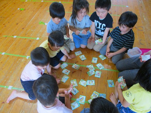 2020年05月22日 かるたあそび 4歳児 ほし 室内で「みんなでかるたする?」と誘うと、「するする」と集まってきました。 読み始めると、絵札を真剣な表情で見つめながら探しています。 こどもたちも「かるた読みたい」と言っていたので一緒に読むことに… こどもだけで読むのはまだ難しいですが、一生懸命文字を読もうとするこどもたちが可愛らしいです。 一覧へ戻る